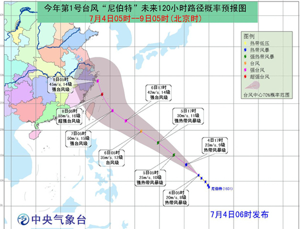 根据浙江省气象台的消息:7月5日8点,“尼伯特”加强为台风级别,14时位于距离温州东南方向约1970公里的洋面上,即北纬16.2度、东经135.1度,中心附近最大风力为13级(40米/秒),中心气压960百帕。过去6小时“尼伯特”向西北方向移动了约187公里。预计“尼伯特”将以每小时30~35公里左右的速度向西北方向移动,强度逐渐加强,并逐渐向台湾到华东沿岸靠近。